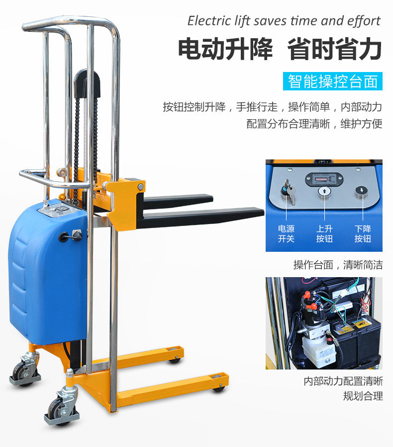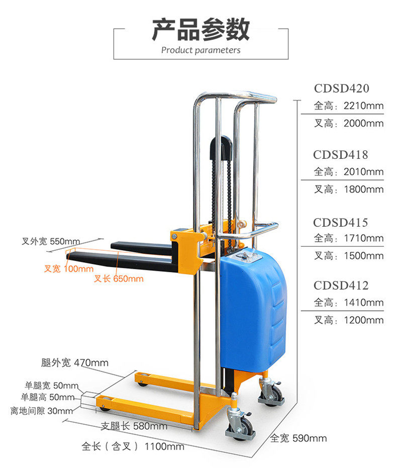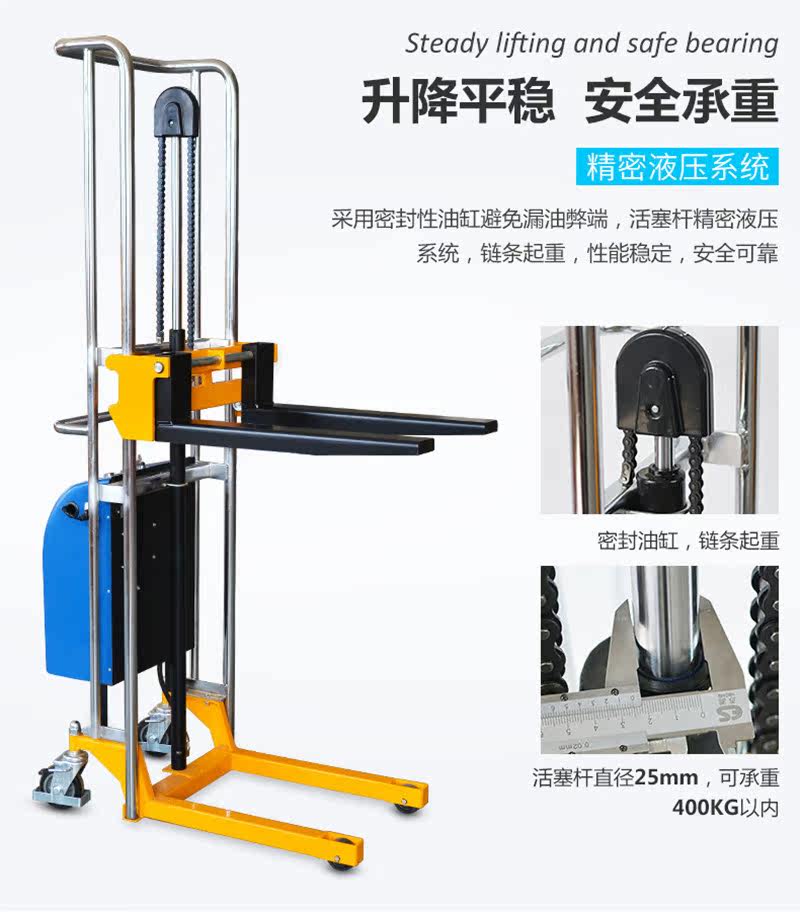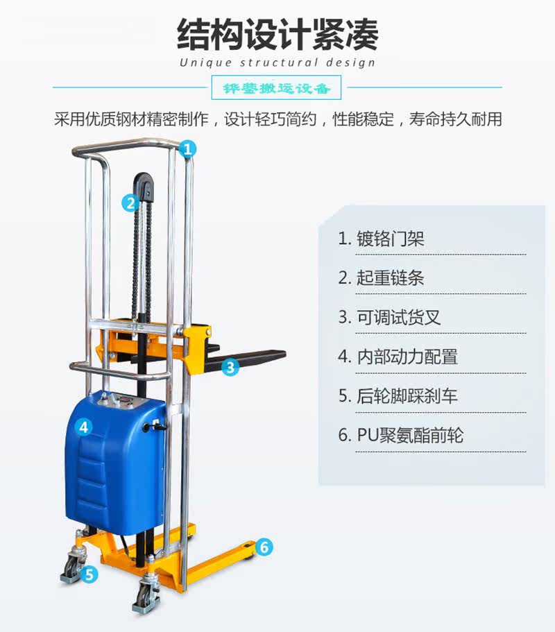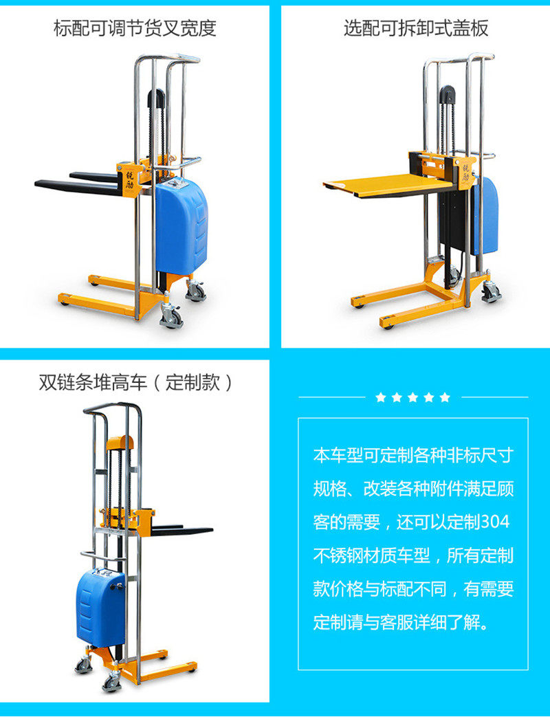 该堆高车主要用于在水平地面上搬运、提升、堆垛物料模具,广泛运用在仓库、工厂车间、医院、商场等地。